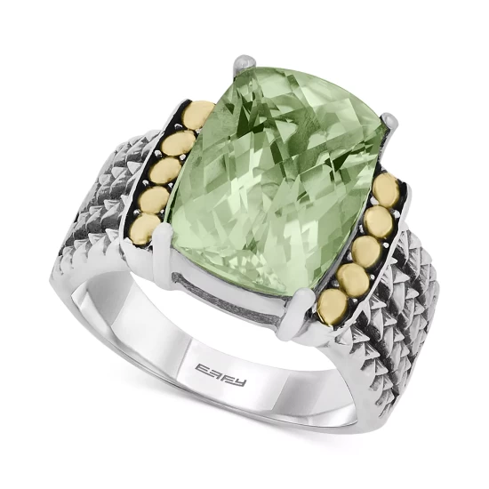 Lush brilliance. EFFY’s ring features emerald-cut green quartz (5-3/4 ct. t.w.) framed with 18k gold trim. Crafted in sterling silver.