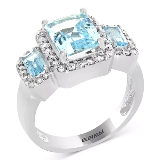 A trio of emerald-cut aquamarine gemstones glow within halos of diamonds on this dramatically beautiful ring from EFFY®.