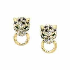 Gorgeous white diamond baguettes and round-cut black diamonds add an exotic shimmer to this iconic panther head pendant necklace, designed with emerald eyes, from EFFY®