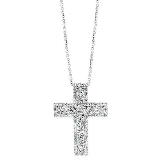 A scattering of baguettes is outlined with round-cut diamonds in this dramatic EFFY® cross pendant necklace.