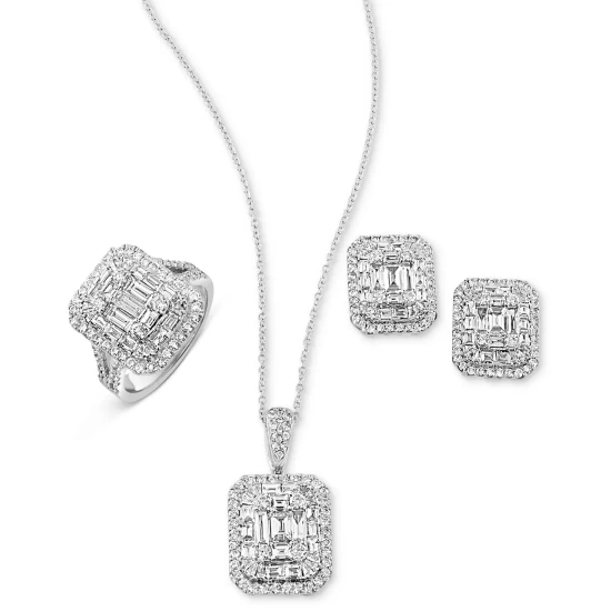 Because for her, glamour is a necessity, this dazzling collection of EFFY® jewelry, featuring matching ring, necklace and earrings, set with round and baguette diamonds in 14k white gold.