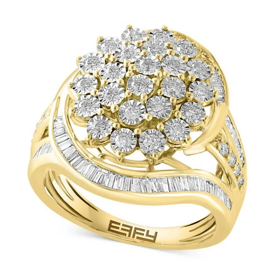A breathtaking round-cut diamond cluster is set within swirls of baguettes in this ultra-glamorous ring from EFFY®.
