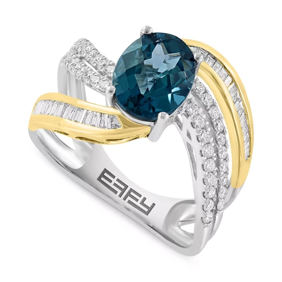 Absolutely spectacular, this beautiful EFFY® bridal set features an engagement ring, with a princess-cut center, surrounded by a halo of marquise-cut diamonds, and then set on a band of baguettes. The wedding band continues the look with additional diamond baguettes.