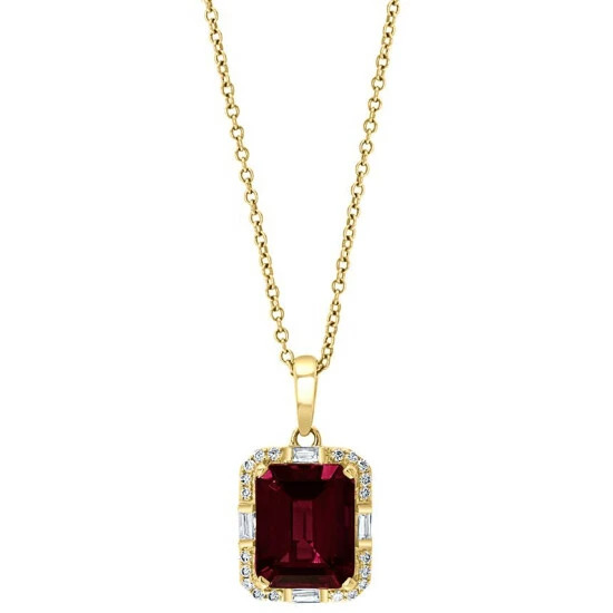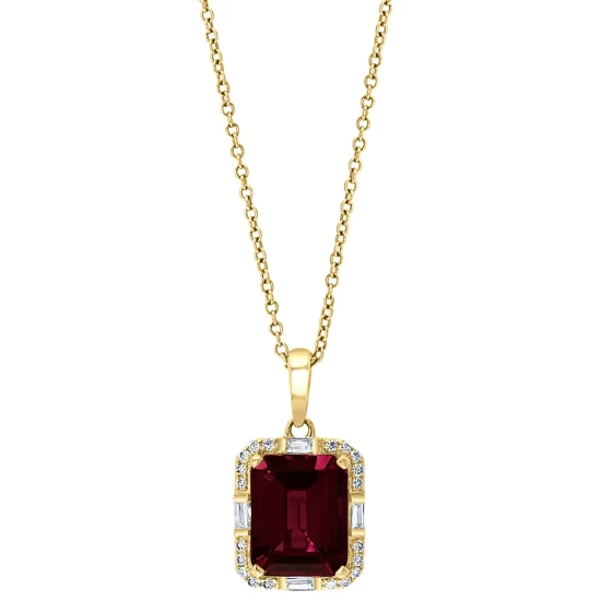 Take her breath away with this beautiful pendant from EFFY®, featuring a gorgeous emerald-cut garnet wrapped in a halo of round and baguette diamonds.
