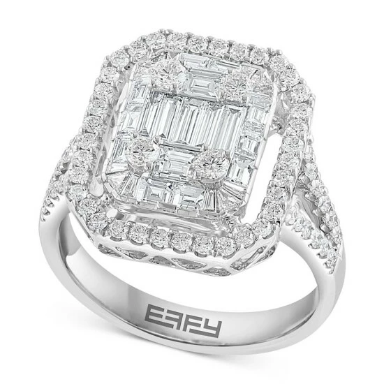 An elegant baguette and round-cut diamond cluster is embraced by a rectangular halo on this stunning ring from EFFY®.