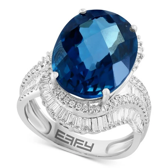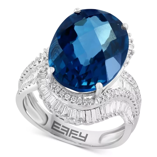 The alluring glow of a London blue topaz is enhanced by an array of round and baguette diamonds in this Limited Edition ring from EFFY®.