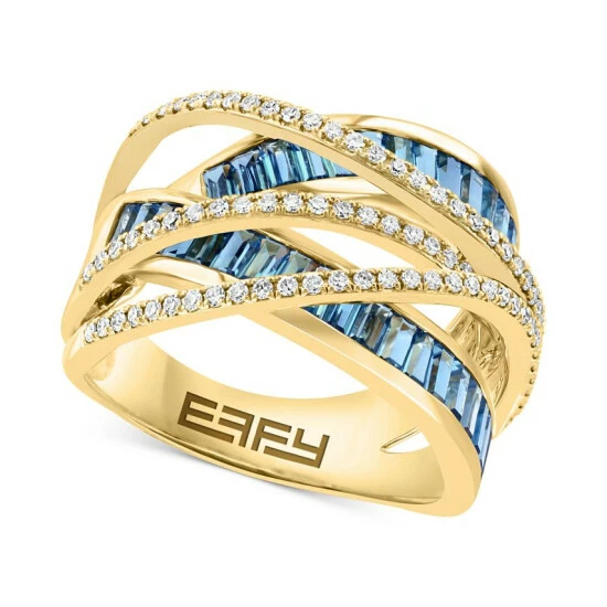 Three sparkling rows of diamonds crossover double rows of emerald-cut London blue topaz in the dramatically elegant statement ring from EFFY®.