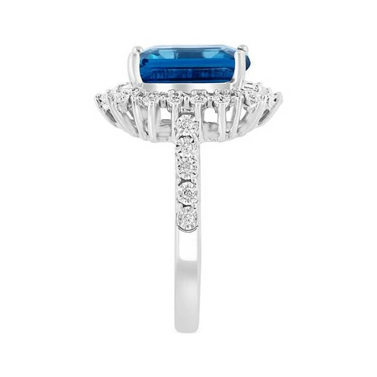 Take her breath away with the beauty of this EFFY® ring, set with a gorgeous emerald-cut London blue topaz embraced by a halo of round-cut and baguette diamonds.