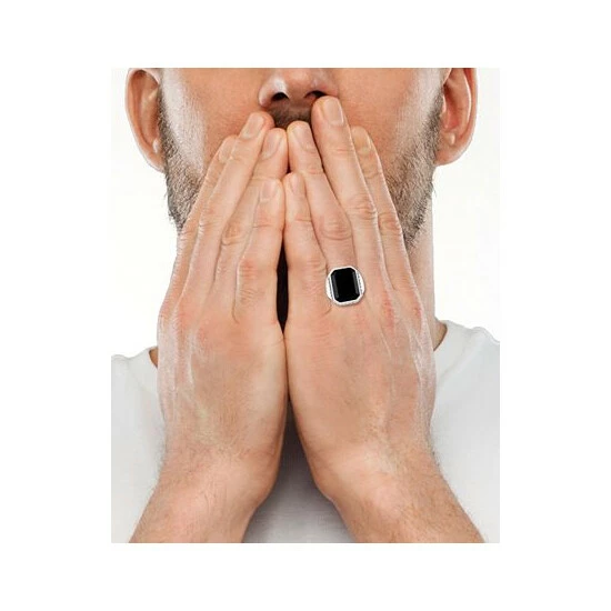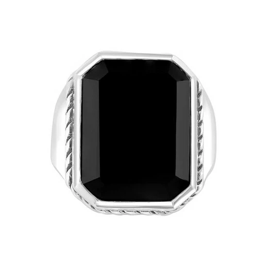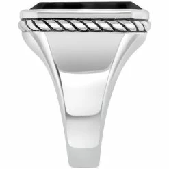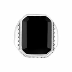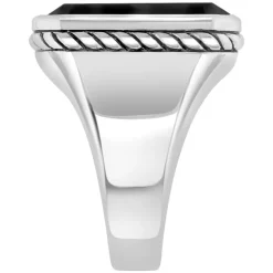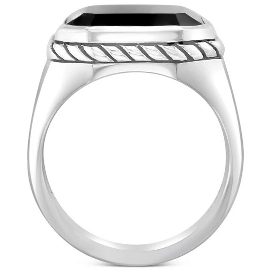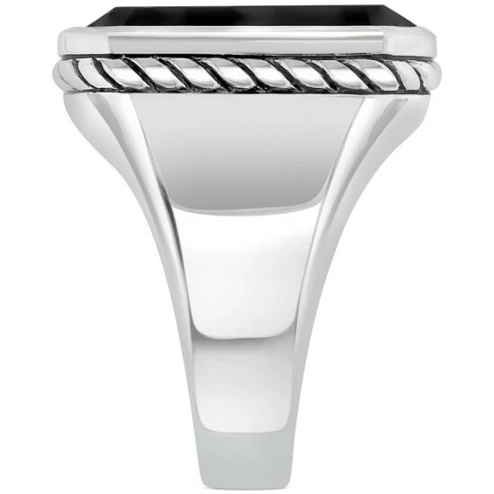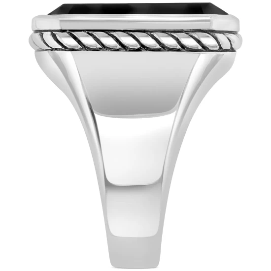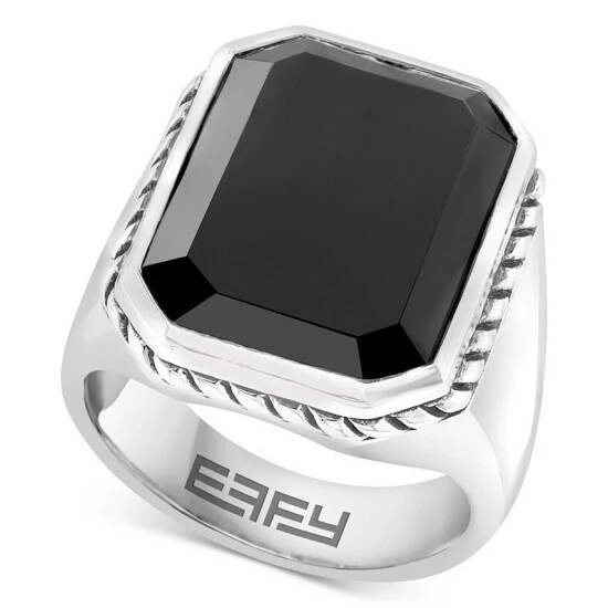 A sleek, dark onyx is set in a rope-inspired frame on this men’s statement-making sterling silver ring from EFFY®.