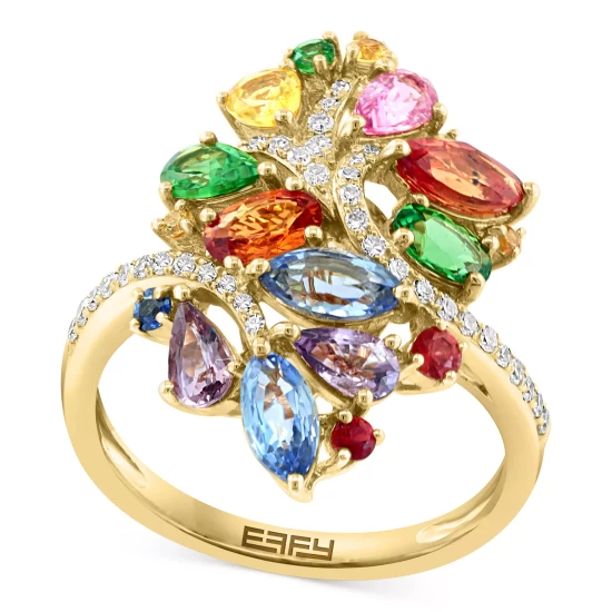 A stunning cluster of multicolor, multi-cut sapphire & tsavorite is accented by glistening diamond swirls in this enchanting statement ring from EFFY®.