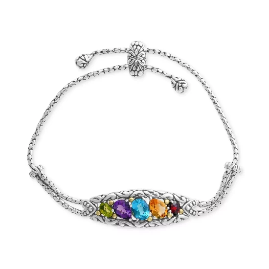 Indulge your sense of whimsy with this stunning bracelet from EFFY featuring multiple gemstones set in sterling silver with 18k gold accents. Gemstones include oval-shaped blue topaz and peridot, pear-shape amethyst and citrine and cushion-shaped rhodolite garnet. Bolo clasp. Approximate adjustable length: 7″.