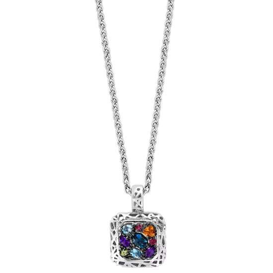 The rich tones of amethyst, blue topaz, London blue topaz, citrine, pink tourmaline, and peridot are clustered together in an intricate openwork frame on this pendant necklace from EFFY®.