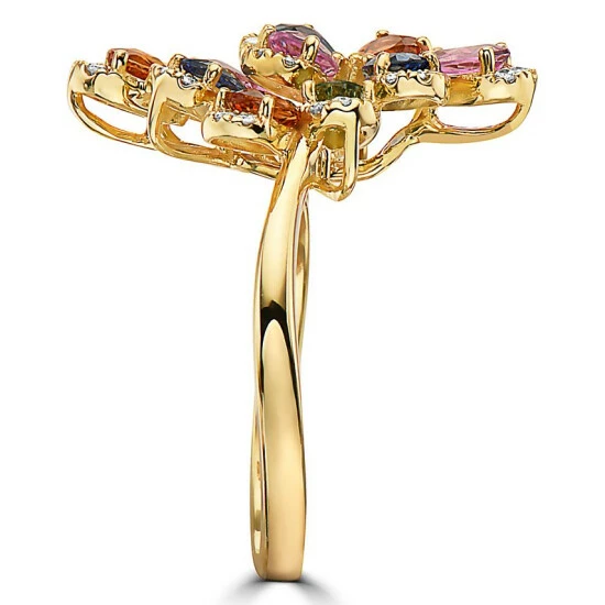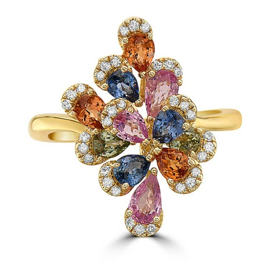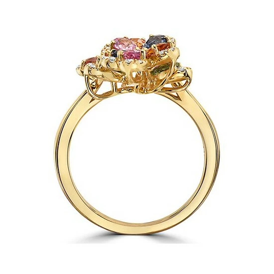Delicate multicolor sapphire petals are edged with diamonds on a stunning floral statement ring from EFFY®.