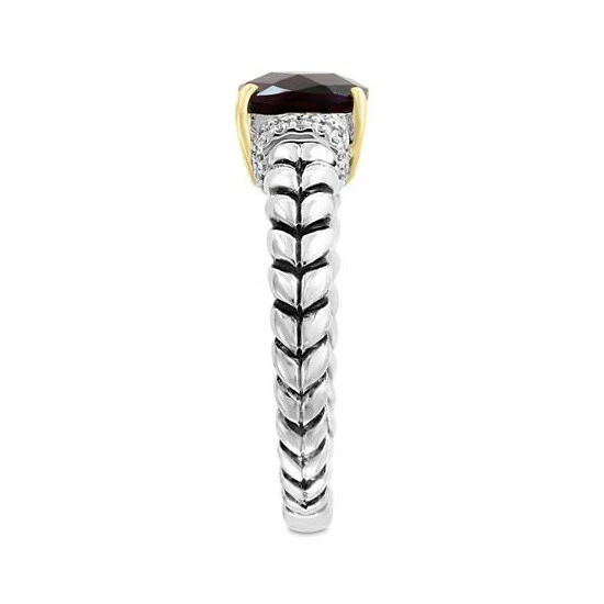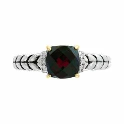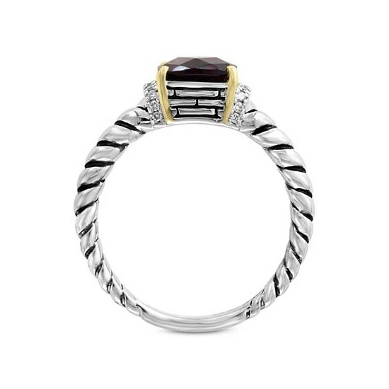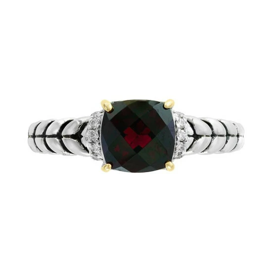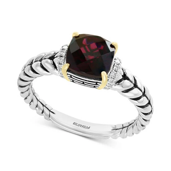 Encapsulated by a setting of 18k gold, a cushion-shape rhodolite garnet brings crimson glamour to this diamond accented sterling silver ring from EFFY.