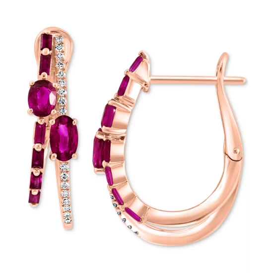 Beautiful oval-cut and baguette rubies are set with glistening diamonds to create these artfully designed leverback hoop earrings from EFFY®.
