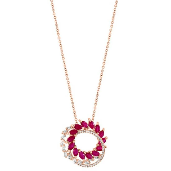 EFFY® delivers enchantment with this beautiful interlocking circle pendant necklace set with marquise rubies, with round and baguette diamonds.