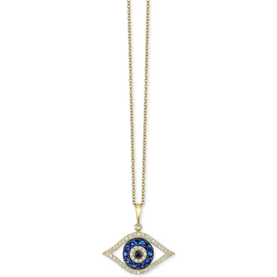 Keep safe the stylish way. EFFY Collection’s good luck pendant features the evil eye with round-cut sapphires (1/4 ct. t.w.), white diamonds (1/8 ct. t.w.) and black diamond accents. Set in 14k white gold or yellow gold. Approximate length; 18 inches. Approximate drop length: 13/20 inch. Approximate drop width: 18/25 inch.