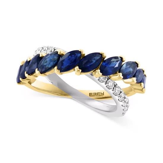 A dazzling ribbon of marquise-cut sapphires crosses over a band of diamonds in this dramatic two-tone statement ring from EFFY®