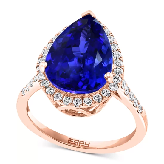 A teardrop halo of diamonds embraces an unfathomably beautiful pear-cut tanzanite in this stunning rose gold ring from EFFY®.