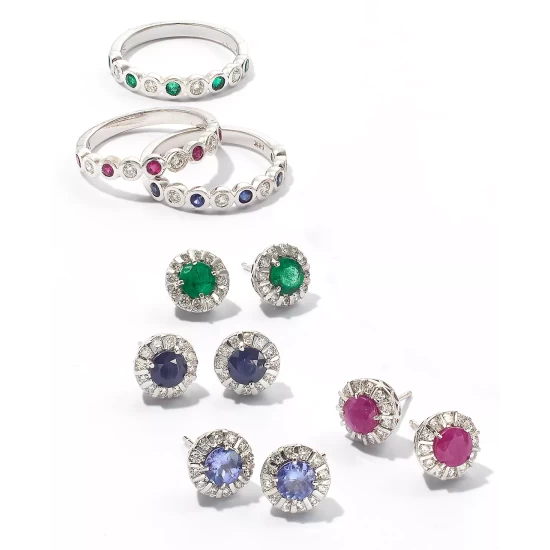 Simple stud earrings that make a colorful and stunning statement. You’ll elevate any look instantly when you add the light-catching beauty of these round-shaped gemstone and diamond earrings from EFFY. Set in 14k white gold, they’re available in sapphire, emerald, ruby or tanzanite—the perfect gift for September, May or July birthdays—or for the girl who just loves the lovely lavender hue of tanzanite. A ring of diamonds around each gemstone completes this gift-worthy pair.