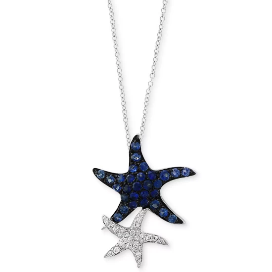 A delightful duo of elegant starfish grace this round-shape sapphire and diamond pendant necklace from EFFY set in 14k white gold. Lobster clasp. Approximate length: 18″. Approximate drop: 7/8″.